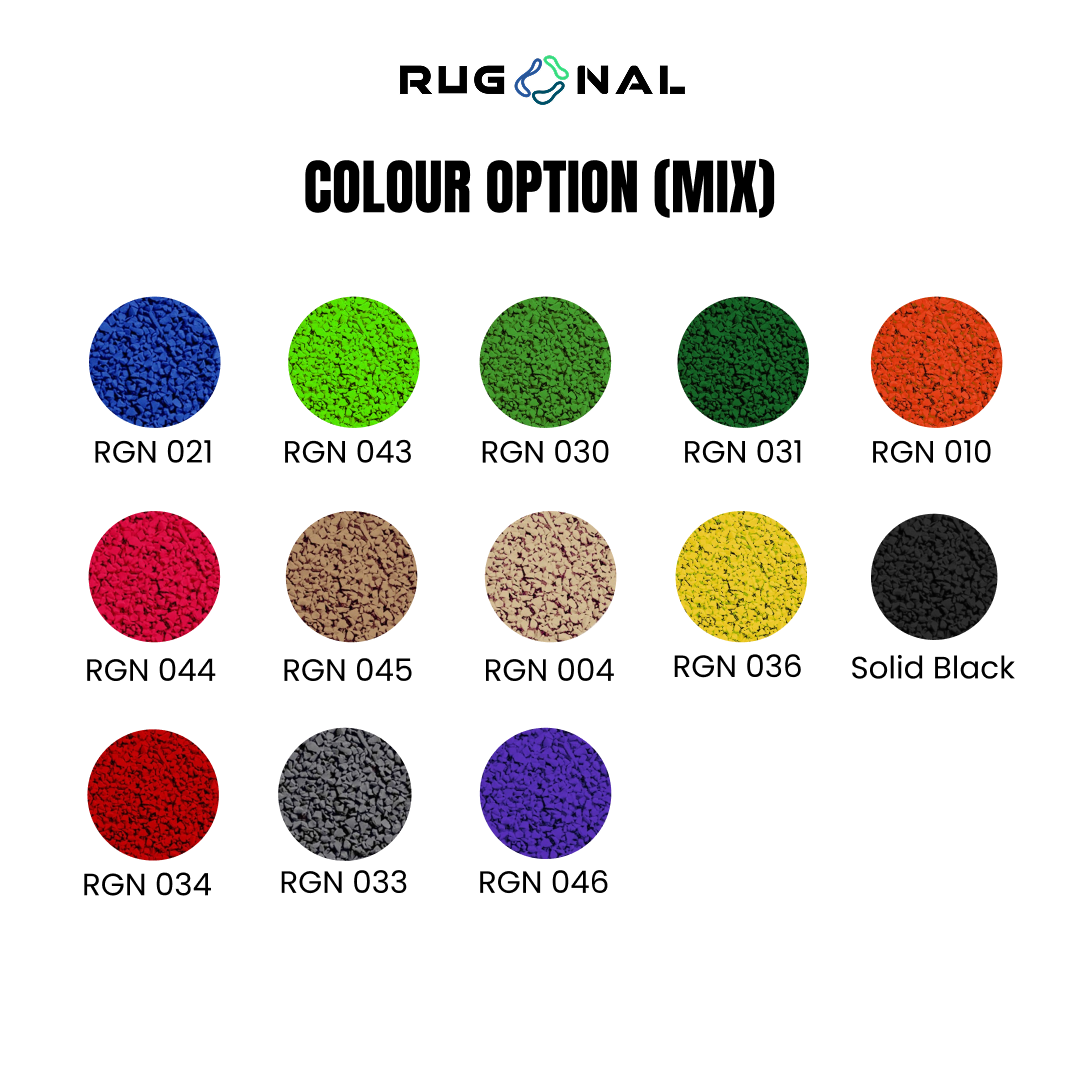 * Kuning: Warna optimisme, keceriaan, dan intelektualitas. Lantai karet RUGONAL berwarna kuning dapat merangsang otak untuk berpikir kreatif, meningkatkan konsentrasi, dan memberikan perasaan hangat serta ceria. Cocok untuk area belajar atau pojok kreativitas.