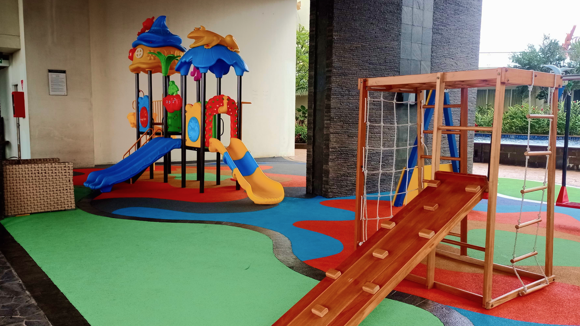 Warna-warna ini adalah pilihan yang sangat populer untuk area bermain anak karena kemampuannya memicu semangat dan keceriaan.